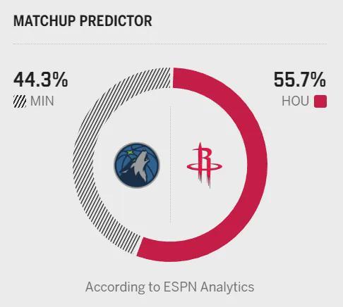两队都是联盟攻防一体的球队,火箭防守效率第4、进攻效率第3,森林狼进攻效率第8、防守效率第6。不过,森林狼的整体投篮和三分命中率更占优势,且擅长攻守转换,内线得分、二次进攻等数据表现亮眼,极其考验着火箭的防守整体性;而火箭近期进攻低迷,上一场不敌雷霆创赛季得分新低,连续多场三分命中率低于30%,进攻端的复苏是取胜关键。此外,两队均缺乏首发级控卫,森林狼的康利年迈、迪林厄姆尚嫩,火箭则依靠申京担任组织中锋,这也为比赛增添了不确定性。ESPN赛前预测火箭今天取得的概率为55.7%,森林狼取得的概率则是44.3%。